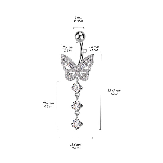 CZ Butterfly With 3 Round CZ Dangle Navel Bar