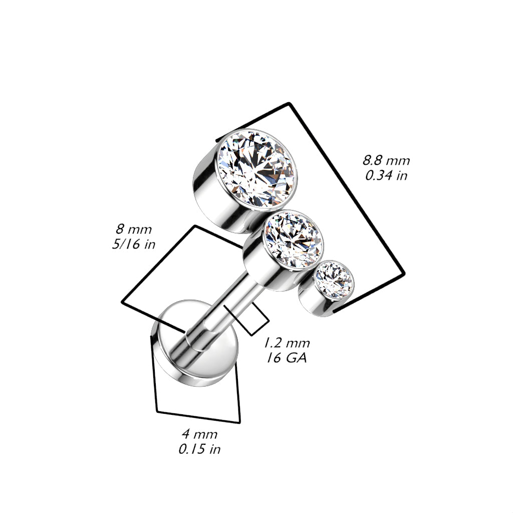 Labret With Descending Bezel Set 3 CZ Curved Top
